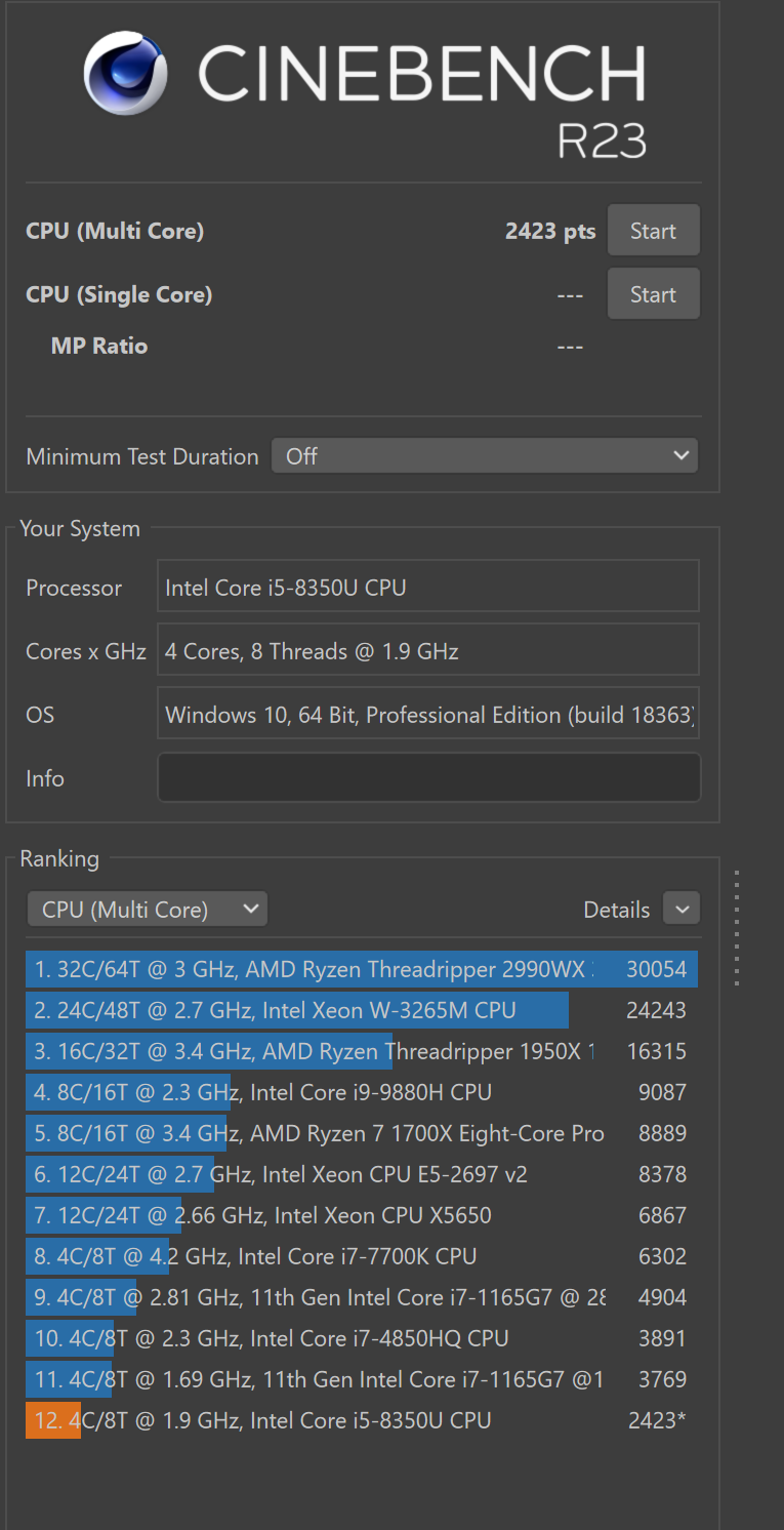 CPU: Intel Core i5 8350U @1.7GHz
